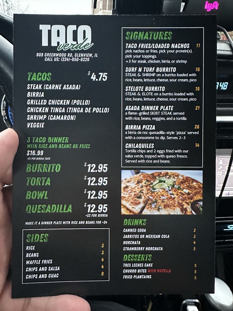 Welcome to Taco Verde! Nestled in the heart of Glenview, Illinois, Taco Verde is a delightful Mexican dessert haven that elevates your dining experience with its vibrant flavors and inviting atmosphere. Whether you're craving traditional tacos or a sweet ending to your meal, this halal-certified gem offers a unique culinary experience that blends the warmth of Mexican cuisine with a modern twist.